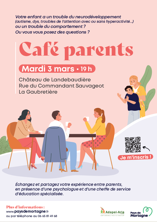 Dans le cadre de la 3ème édition de la semaine du handicap du 2 au 7 mars 2026, le Pays de Mortagne vous invite à une soirée café parents le mardi 3 mars à 19h au château de Landebaudière, animé par Mme RAUD, cheffe de service d'éducation spécialisé et Mme PINEAU, psychologue. Cette soirée à pour but de permettre aux parents de partager leurs inquiétudes et leurs problématiques et d'être orientés et conseillés par les intervenantes.