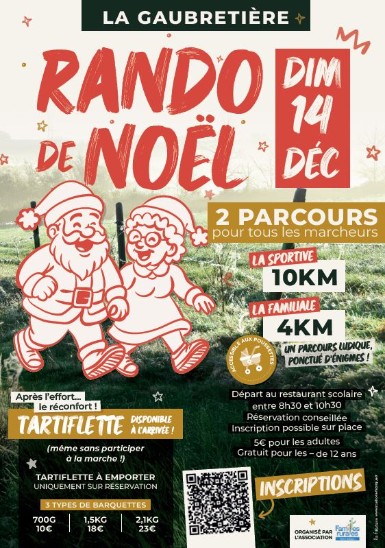 L'association Familles Rurales La Gaubretière organise sa traditionnelle Rando de Noël le dimanche 14 décembre, avec deux parcours accessibles à tous : un circuit familiale de 4 km, agrémenté d'énigmes, et un parcours de 10 km.