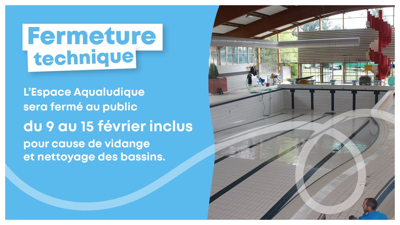 L’Espace Aqualudique sera fermé au public du lundi 9 au dimanche 15 février inclus, pour cause de nettoyage des bassins et vérifications techniques.