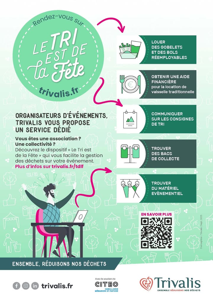 🎉// ASSOCIATIONS // 🆕 Le saviez-vous ? Le dispositif "𝐋𝐞 𝐓𝐫𝐢 𝐞𝐬𝐭 𝐝𝐞 𝐥𝐚 𝐟𝐞̂𝐭𝐞" de Trivalis, c'est : 👉 La location de contenants alimentaires réemployables. 👉 Une aide financière pour la location de vaisselle traditionnelle 👉 Un kit de communication pour le tri des déchets 📍Trouvez aussi où vous procurer des bacs de tri et du matériel. Vous organisez un événement prochainement et souhaitez réduire vos déchets ? Retrouvez tous les détails du sur 🔗trivalis.fr/tdlf #reductiondesdechets #transitionecologique #association #evenement